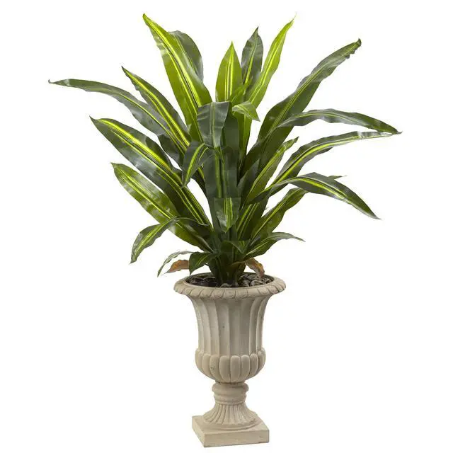 This 5.5' dracaena artificial plant boasts multiple levels of overlapping- long stalk leaves giving a full and lush cascading fountain of green. The multicolored leaves are striped with rich shades of green for an eye catching look. Paired with a classic urn for an elegant touch.