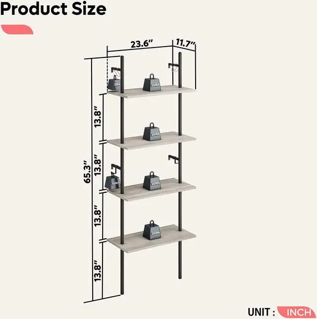 Ample Storage Space: This 4 tier ladder shelf consists of 4 layers of 23.6 * 11.7 inch dividers with 13.8 inch layer spacing which can provide ample storage space without occupying floor space.