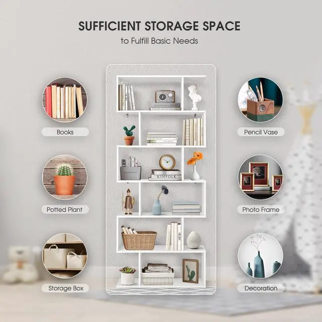 Functional Space Organizer: This 6-tier bookcase measures 75 inches high and provides ample and classified spaces for storage or display. With these cube compartments, you can better organize your stuff or collection, such as books, albums and trophies. The open shelves offer easy access to those frequently used things.