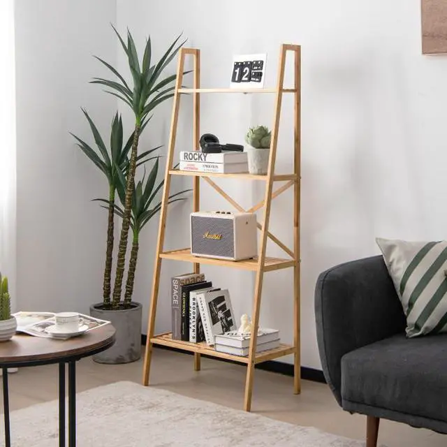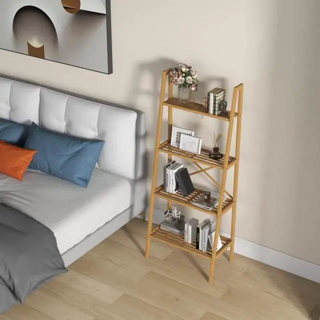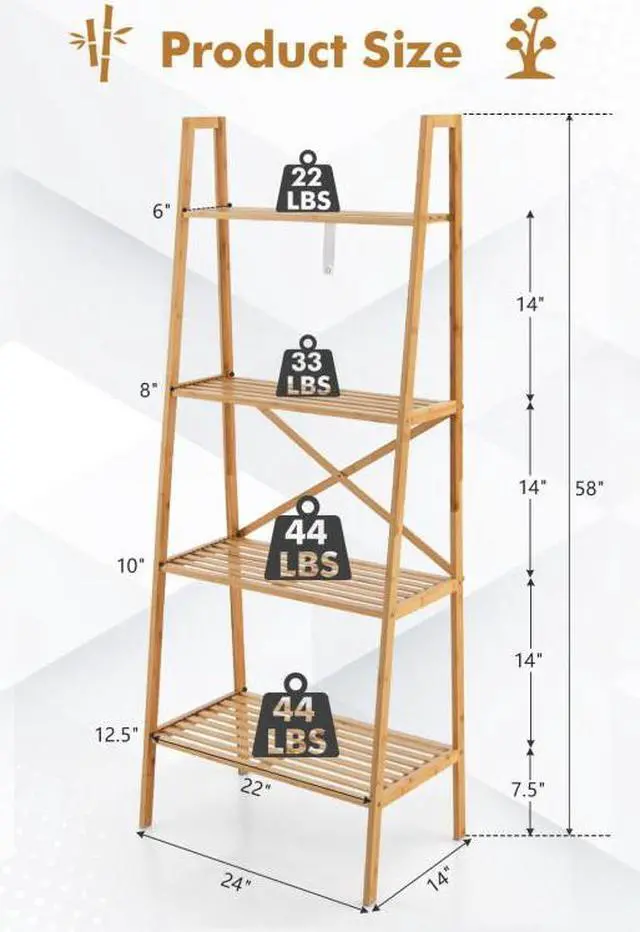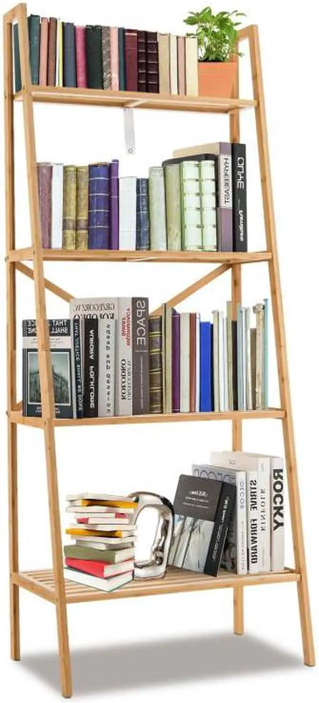 Spacious Storage Space: Featuring 4 shelves of different widths, this 4-tier bamboo ladder bookshelf (14" height between shelves) is carefully designed to accommodate different belongings, such as books, potted plants, ornaments, photo frames, storage baskets and sundries to keep your space tidy and clean.