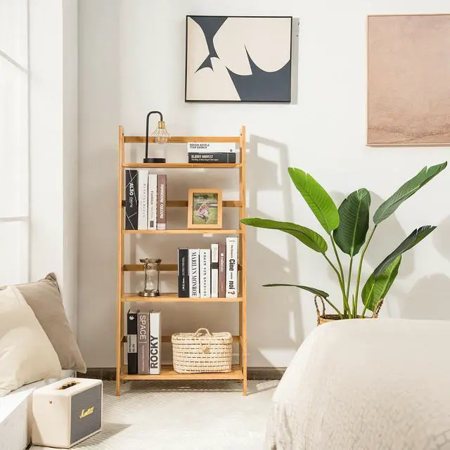 Natural Bamboo and Solid Construction: This freestanding bookshelf is made of 100% natural bamboo, which is sturdy, durable and pollution-free. In addition to the selected material and exquisite workmanship, the shelf is built in a stable ladder shape, so as to keep great stability on the floor.