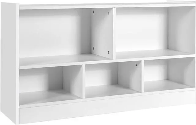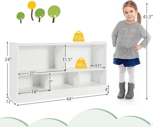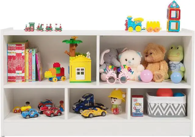 Spacious Cubes for Storage: This kid's bookcase is designed with 5 cubes of 2 sizes that are spacious for storing kid's belongings, such as cartoon books, toys, snacks, clothes and school supplies. And the wide top with elevated edges can be used to hold some knick-knack for display.