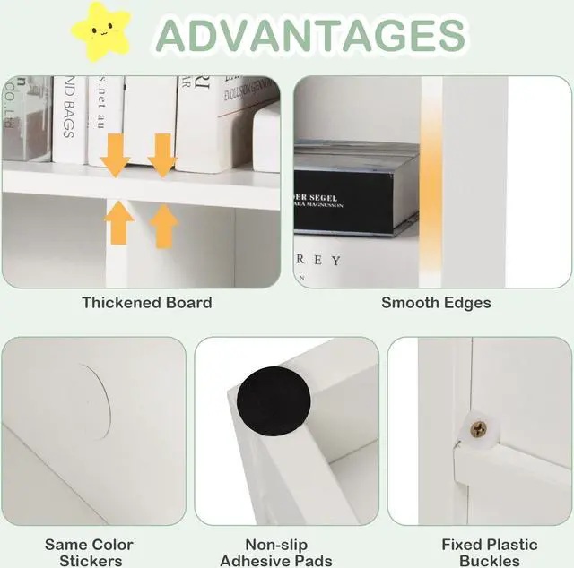 Kid-friendly Design: The bottom is raised up by 4" to prevent the books or toys in the lower shelf from being smeared. The overall height of the cabinet is 24", which keeps things within kids' reach so as to help them develop a good habit of organizing.