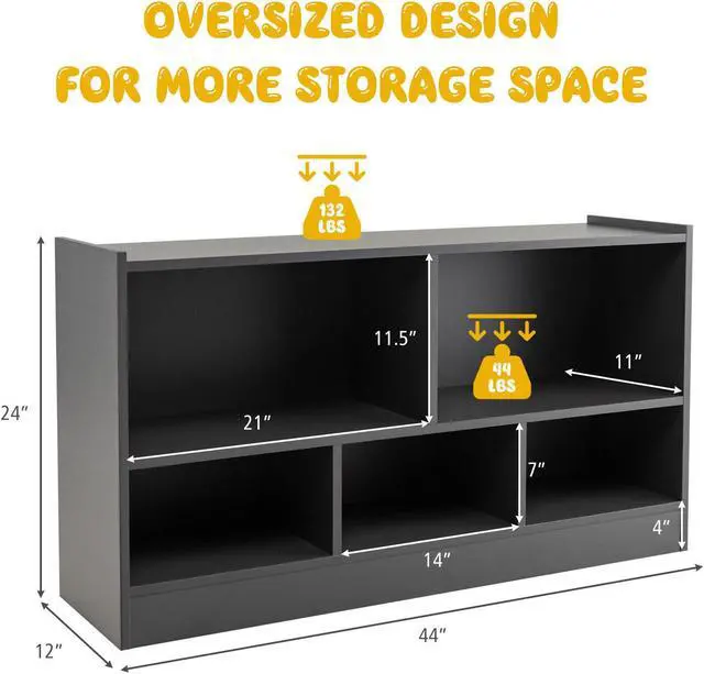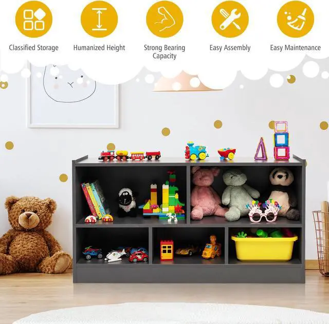 Spacious Cubes for Storage: This kid's bookcase is designed with 5 cubes of 2 sizes that are spacious for storing kid's belongings, such as cartoon books, toys, snacks, clothes and school supplies. And the wide top with elevated edges can be used to hold some knick-knack for display.