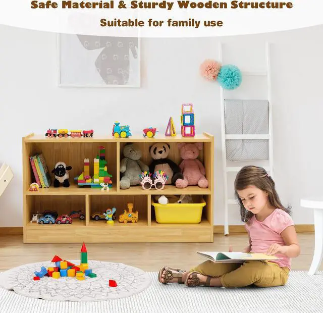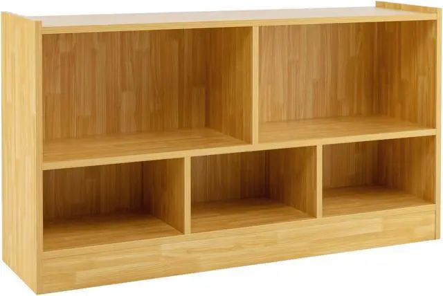 Spacious Cubes for Storage: This kid's bookcase is designed with 5 cubes of 2 sizes that are spacious for storing kid's belongings, such as cartoon books, toys, snacks, clothes and school supplies. And the wide top with elevated edges can be used to hold some knick-knack for display.