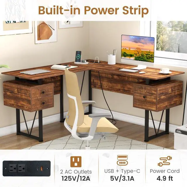 Power at Your Fingertips: This large computer desk comes with a sleek built-in power strip featuring 2 AC outlets, a USB port, and a Type-C port, all within easy reach. Plus, the thoughtful details of 2 cables holes help to keep your workspace tidy without messy cords!