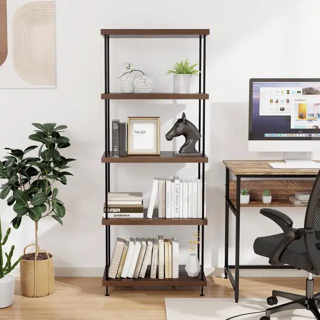 Sleek Industrial Aesthetic: Elevate your room with an industrial bookcase, seamlessly blending with any interior theme. The clean lines and wood grain finish invite a retro style to your environment, making this the ideal showcase for your books, crafts, photos, or plants.