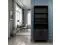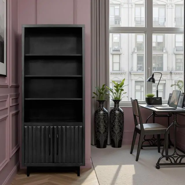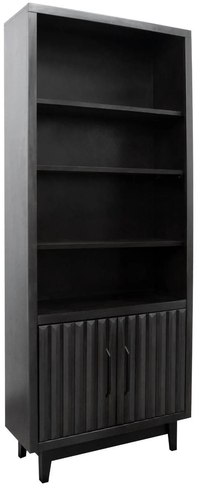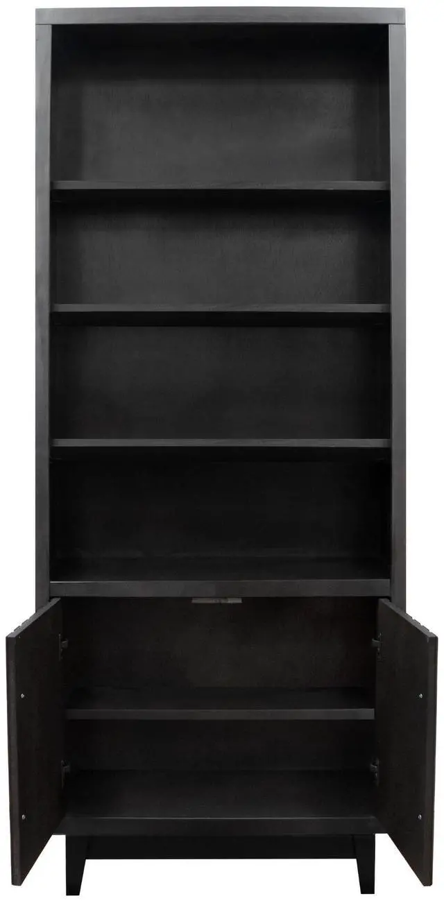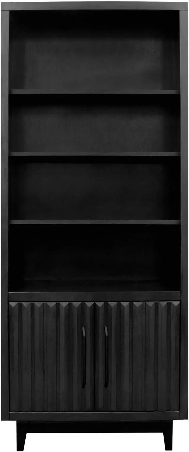 Dimensions: 33" wide x 15" deep x 78" high Made of Poplar Solids and Okume Veneers Black Finish Matte Black Hardware Wood Base and Tapered Leg Two Doors Three Shelves