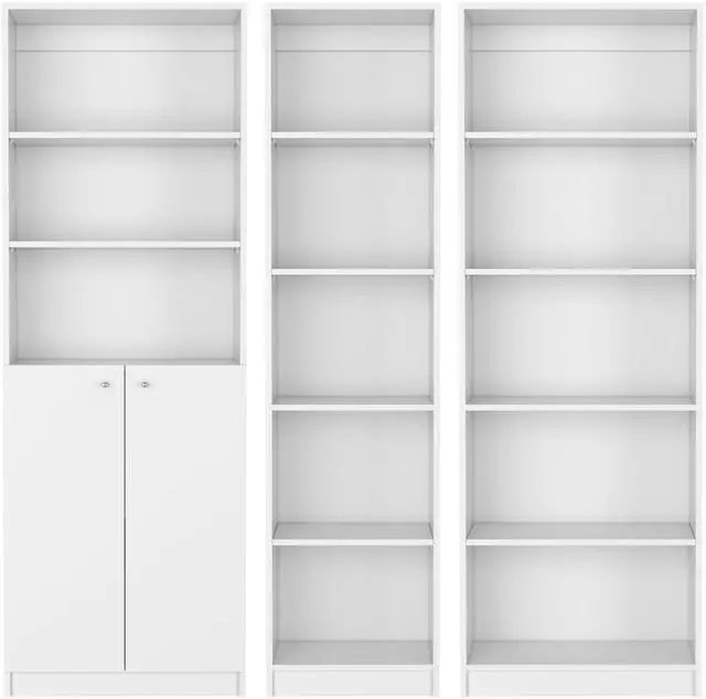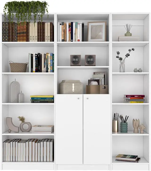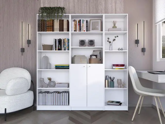 Versatile Storage: Includes a Bookcase 4-Shelves Benzoni featuring four spacious shelves, the compact Bookcase XS Benzoni for smaller items, and a Bookcase Dual-Door Benzoni with additional lower storage shelf for varied needs.