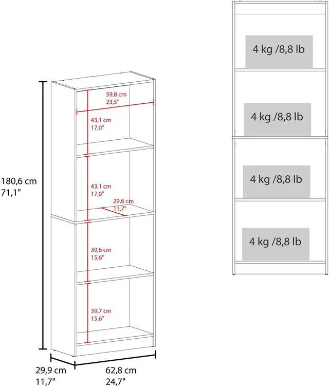 Features four spacious tiers for ample storage and display, ideal for organizing books, decor, or everyday essentials