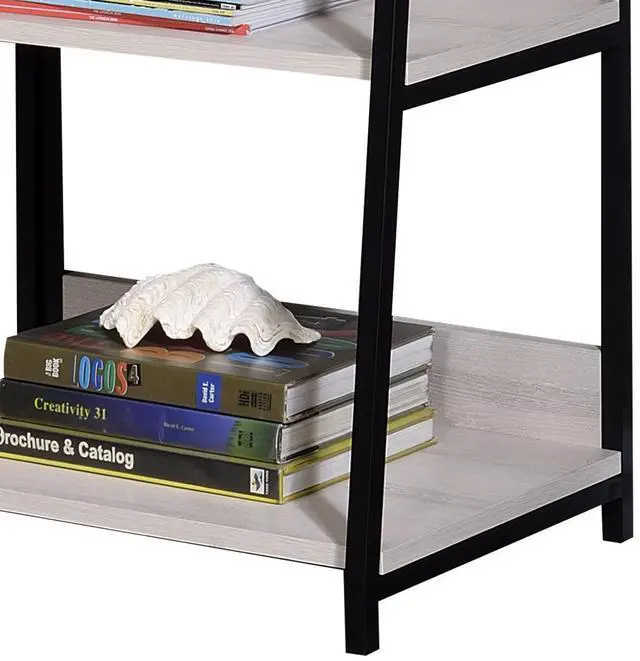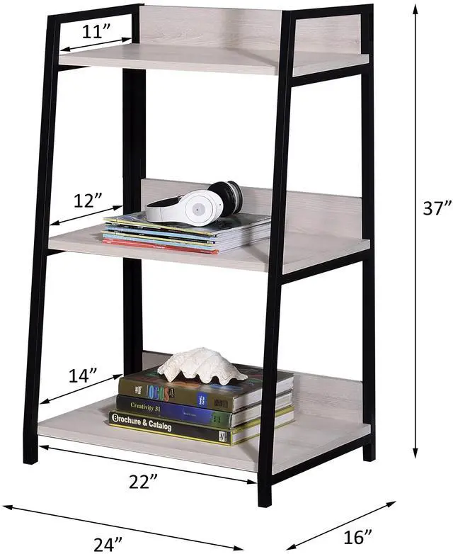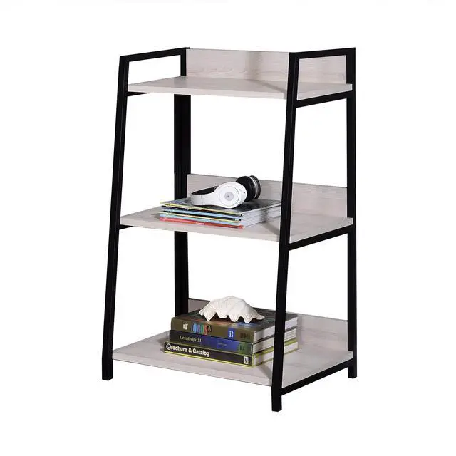 Rectangular /Bookshelf (Leaning-Ladder)Storage: 3 Open Compartment (3 Wooden Shelves, Fixed), Orientation: Freestanding (Wall Tall), Wooden Shelves (Back Open), Metal Frame (Open BAse)