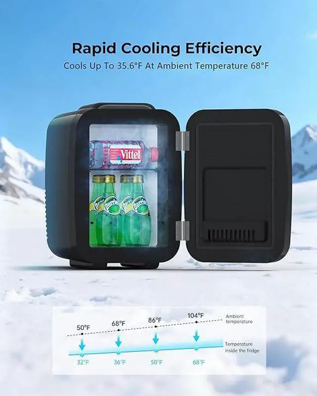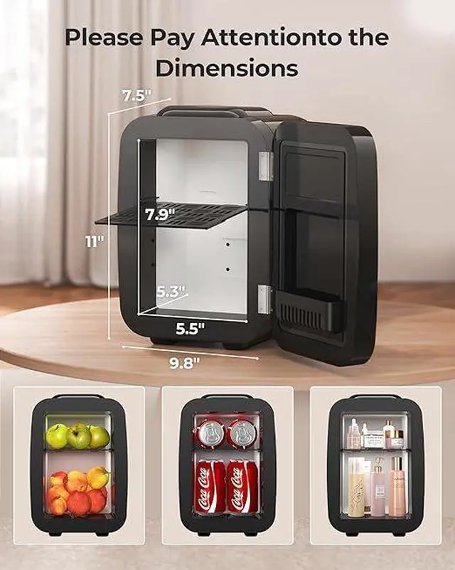 Multi-functional Mini Fridge: This compact small fridge holds up to six 12 oz cans and keeps daily essentials organized and chilled. Suitable for skincare, cosmetics, snacks, drinks, and more. Designed to fit easily on desks, nightstands, countertops, or car interiorsideal for bedrooms, offices, dorms, road trips, and camping.