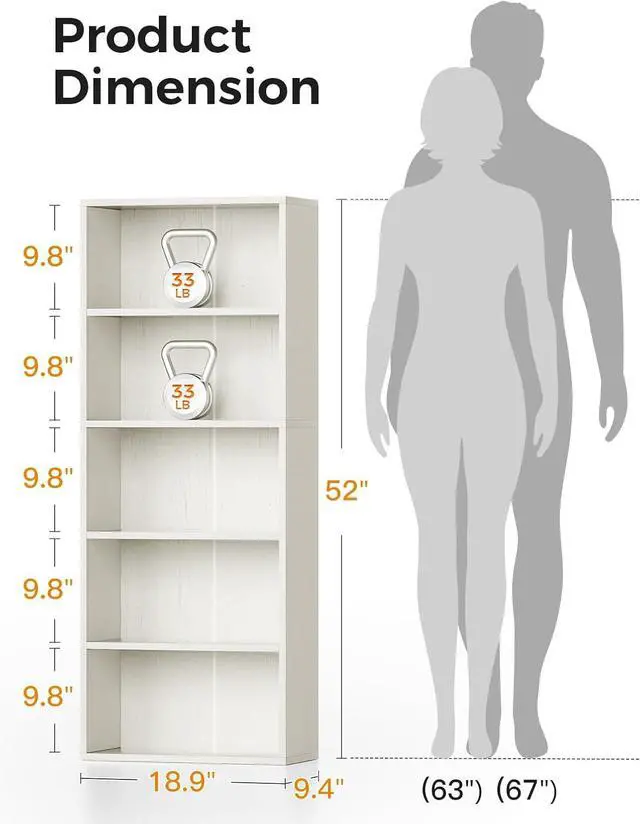 Sleek Design for Any RoomFeaturing a simple shape and compact 18.9"x9.4"x52" size, this 5-shelf bookcase easily fits in living rooms, bedrooms, offices, closets, or small spaces. Its clean look matches any decor style and never goes out of style.