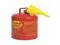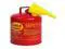 The EAGLE MFG - UI50FS is a Type I Safety Can designed for the safe storage and handling of flammable liquids. This safety can is made from durable galvanized steel with a powder-coated finish, enhancing its resistance to corrosion, chemicals, or extreme temperatures. It has a circular footprint shape that provides stability on various surfaces and measures 15 1/2 inches in height with a capacity of up to 5 gallons. The can's red color aids in differentiating it among other equipment.