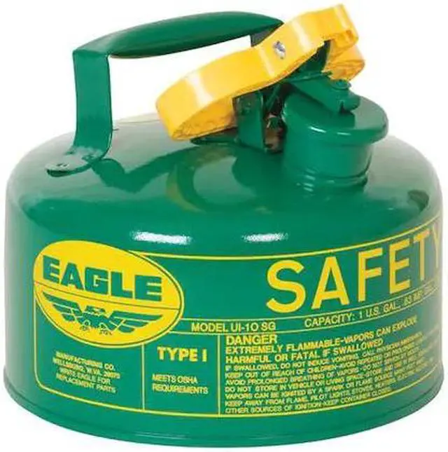 Type I Safety Can, Can Type Type I, DOT Approved Not DOT Approved, Capacity 1 gal, Compatible Fluids Oil, Color Green, Can Material Steel, Material Finish Powder Coated, Hose Outside Diameter Not Applicable, Included Hose/Funnel Not Applicable, Can Diameter 9 in, Overall Height 8 in, Includes Faucet Faucet Not Included, Faucet Channel Diameter Not Applicable, Overall Width Not Applicable, Cap Features Self-Closing, Faucet Location Not Applicable, Footprint Shape Circle. This item has been restricted from sale in the following state (s): []