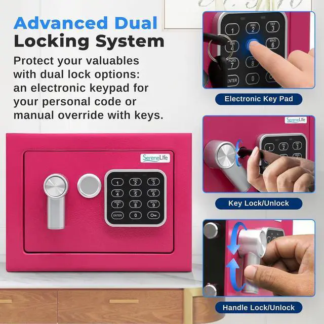 The SereneLife Compact Electronic Safe Box (SLSFE12PI) in a stylish pink finish is the perfect security solution for your home, office, or business. Featuring a digital touchpad and a mechanical override, this safe gives you both electronic and manual access options. The reinforced steel alloy construction ensures durability, while the dual locking bolts provide additional security. It has a corrosion-resistant powder coat finish that is designed to last. The safe's customizable password/key code setting allows for quick and secure access, and the LED low battery indicator ensures you're always ready.