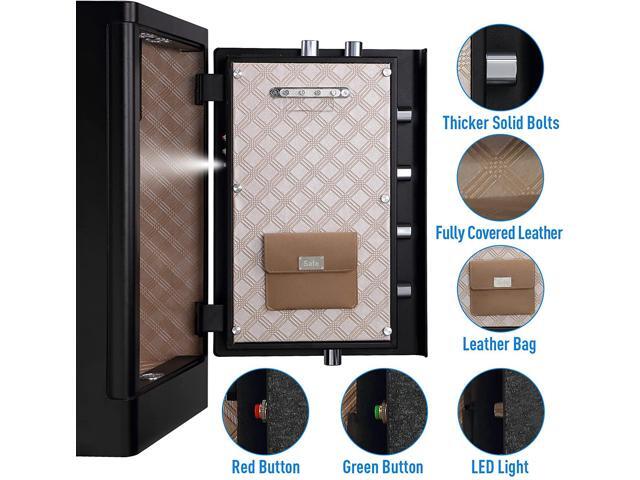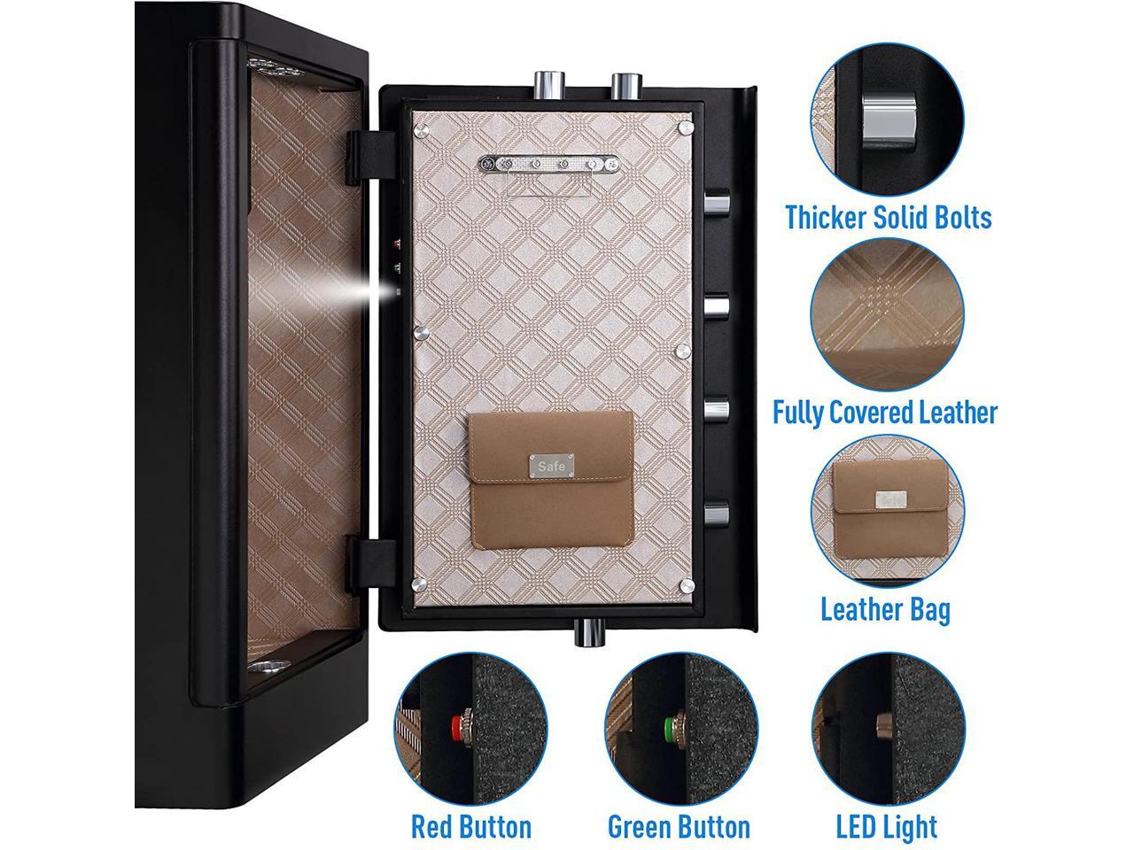- BETTER CONFIGURATION: As soon as you open the security box, the light will light up and go out automatically after 30 seconds. The inside of the safe is covered with leather to prevent wear and tear of valuables.