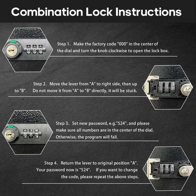 Dual Lock SystemThe metal lock box equipped with dual combination lock and key lock, giving you the option of locking it by key or combination. The combination lock is defaulted to 000 and can be set to the three digits of your choice.