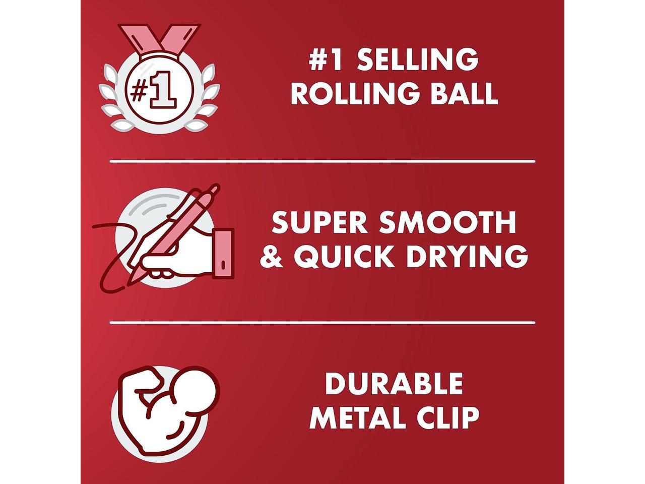 Rollerball design is great for everyday writing. Five pens per pack. Unique liquid ink system provides even flow and smooth marking.