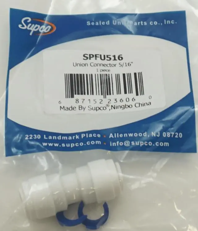 Brand new Supco 5/16" Union Straight Connector, Suitable for Hot and Cold, SPFU516. Quick Connect, No tools required, Manufactured from high quality engineering plastic.