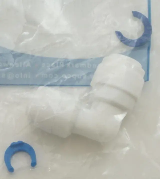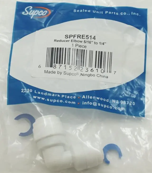 Brand new Supco 5/16" to 1/4" Reducer Elbow 90 Degree angle, Hot or Cold Applications, SPFRE514. Quick Connect, No tools required, Manufactured from high quality engineering plastic.
