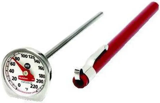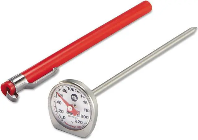 Pocket-pen-sized thermometer is perfect for HVAC professionals, refrigeration technicians and automotive mechanics. Compact dial provides easy-to-read convenience. User-calibration design enables fine tuning. Long, thin probe and tip-heavy balance simplify placement. Stainless steel casing lends itself to commercial-grade applications. Plastic sleeve with pocket clip protects probe while delivering carry-and-go convenience. AnalogDishwasher-safe. Meter Type: Thermometer; Temperature Scale: Fahrenheit; Measurable Range: 0°F to 220°F; Analog/Digital: Analog.