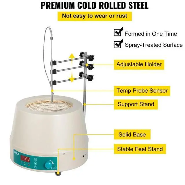 Easy to use, high precision, temperature display intuitive. Sensitive Sensor The heating mantle stirrer features a sensitive sensor, accurately monitoring and controlling the temperature in time. Solid Base Equipped with stable feet stand to ensure the stability of the heating mantle with a stirrer, it can still be stable when running at high speed. Wide Application The heating mantle magnetic stirrer is the ideal equipment for liquid heating and stirring. Used in modern petroleum, chemical, medical and health fields, environmental protection, biochemistry, and other fields. Specification Capacity 2000ml Voltage 110V Frequency 60Hz Max use temp 350 Power 450W Speed 0-1400rpm Working time continuous Ambient temperature 5~40 Ambient humidity 90% Exterior size 330x230mm Package weight 13lb Package Content 1 x Main unit 1 x Power cable 1 x Temperature probe 1 x Stir bar 1 x Holder 1 x English manual