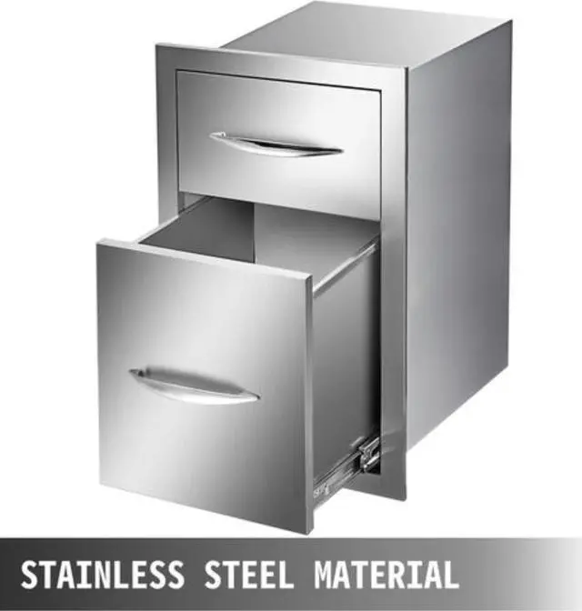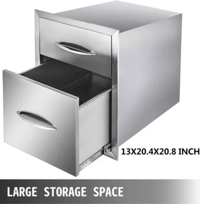 Widely used in the outdoor kitchen, such as tableware, into the cabinet, lockers. Specifications Material Food-grade Stainless Steel Color Sliver Dimensions 20.8 x 13 x 20.4 inch /53 x 33 x 52 cm (L x W x H) Installation size 20.4 x 10.8 x 18.1 inch /52 x 27.5 x 46 cm (L x W x H) Top Drawer Dimensions 10.43 x 19.49 x 5.90 inch / 26.5 x 49.5 x 15 cm (L x W x H) Bottom Drawer Dimensions 10.43 x 19.49 x 12 inch/ 26.5 x 49.5 x 30.5 cm (L x W x H) Package size 24.4 x 22.0 x 14.5 inch/ 62 x 56 x 37 cm (L x W x H) Gross weight 30.4 lbs/ 13.8 kg Package Content 1 x Chest of Drawers 1 x Set of Installed Accessories 3 x Handles