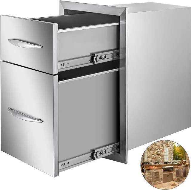 Also anti-corrosion and easy to clean. With the fully enclosed box, it can effectively prevent the insides from rain, wind, dust, and insect. Perfect for the outdoor kitchen and BBQ island to use. Stainless Steel Material Double Storage Space Box Frame Design Wide Application Key Features Stainless Steel MaterialThe stainless steel drawers are made of high-quality stainless steel, it can be cleaned up well with no marks or smudges left, one-piece frame construction for durability. Large Storage Space Provide double storage space in a weather-sealed box, each of our outdoor grill drawers has very big storage, able to contain more kitchen tools and offers convenient storage opportunities.