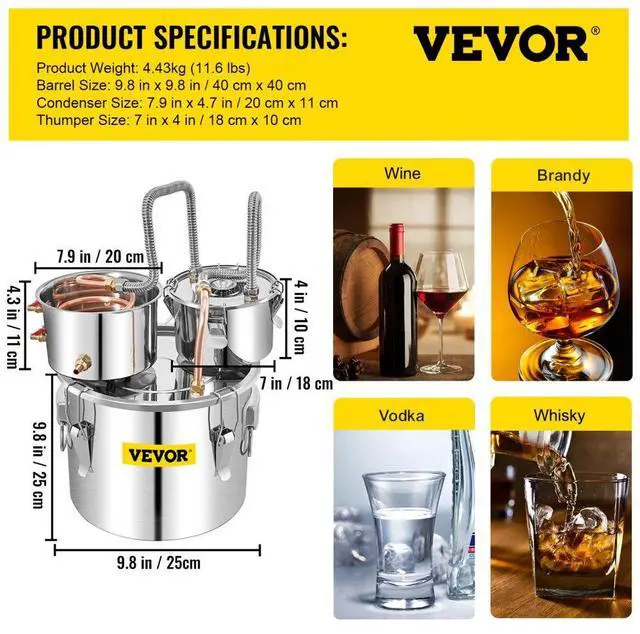 ZLSJ3GALSLNTZLQDBV1 3gal 12l Distiller System Stainless Water Wine Moonshine Boiler Home, [SUFFICIENT CAPACITY]- Moonshine still machine owns 3.3 US GAL large capacity, able to distill 12.3 liters of raw material by heating to selectively boil and then cooling to condense the vapor. Boiler barrel 10" x 11.8" (25 x 30 cm). Condenser 7.9" x 5" (20 x 13 cm). Thumper 7" x 4.3" (18 x 11 cm). All parts are made of food grade material including silicone, stainless steel and copper. [SPEEDY COOLING]- This water distiller adopts open-type cooling method, copper coils with rapid thermal conductivity assures promising cooling performance together with large contact area with the coolant, providing a rather low temperature of distilled product.