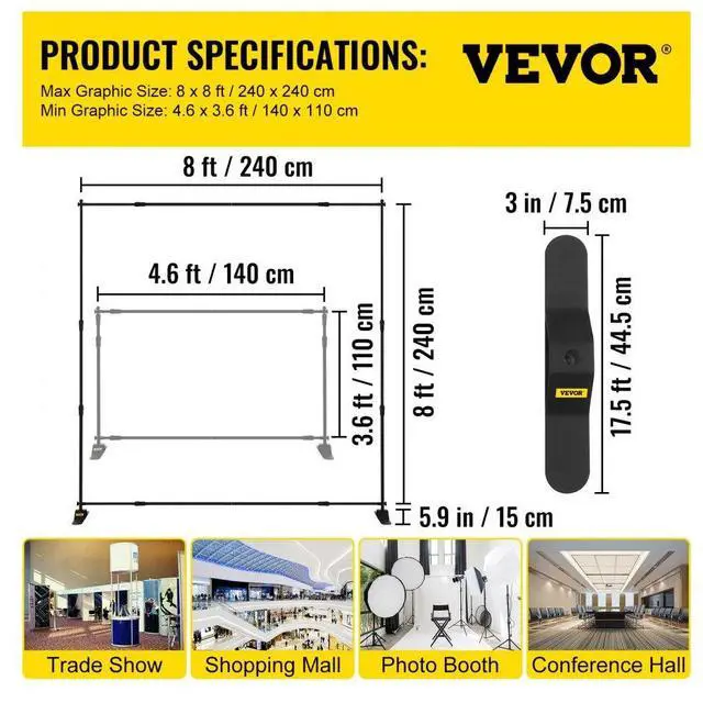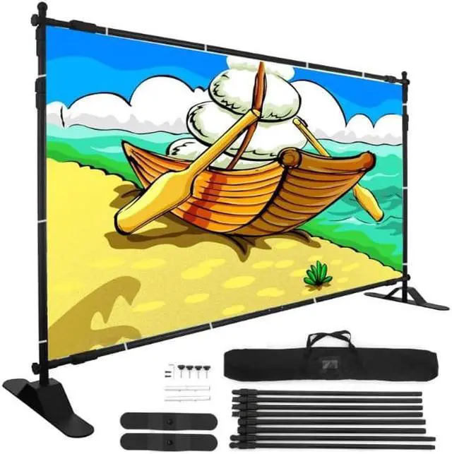 Width Range: 57.1"-94.5"/145-240 cm,Tube Wall Thickness: 0.05"/1.2 mm,Load Capacity: 4.4 lbs/2 kg,Height Range: 35.4"-94.5"/90-240 cm,Base Size (L x W): 17.5" x 3"/44.5 x 7.5 cm,Color: Black,Model: ZSJ-8x8,Min Graphic Size (W x H): 57.1" x 35.4"/145 x 90 cm,Product Weight: 12.8 lbs/5.8 kg,Frame Material: Aluminum,Max Graphic Size (W x H): 94.5" x 94.5"/240 x 240 cm,Base Material: Iron