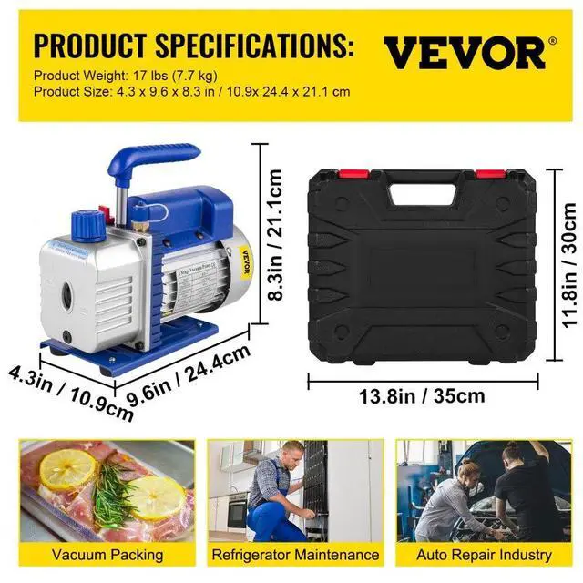 Rotating Speed: 1440 RPM,Ultimate Vacuum: 5 Pa,Low pressure: 0~500psi,Intake Fitting: 1/4" & 3/8",Vacuum Pump: Single Stage,Power /Voltage: 1/4 HP, 110V / 50-60Hz,Connection size: 1/4"SAE, 5/16SAE",Hose Burst pressure: 4000PSI,Free Air Displacement: 3CFM, 84 L/M,Hose Max working pressure: 800 PSI