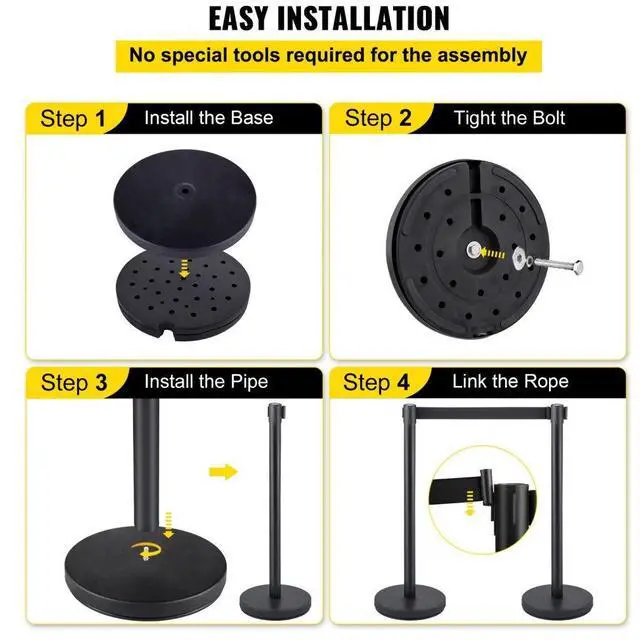 Belt Material: Nylon,Overall Height: (Approx.) 35.4 in / 90 cm,Pole Thickness: 0.03 in / 0.8 mm,Base Diameter: 12.6 in / 32 cm,Number: 6 Pcs,Model: Stanchions 6Pcs,Belt Length: 6.6 ft / 2 m,Main Material: Stainless Steel,Belt Color: Black,Item Weight: 81 lbs / 37 kg