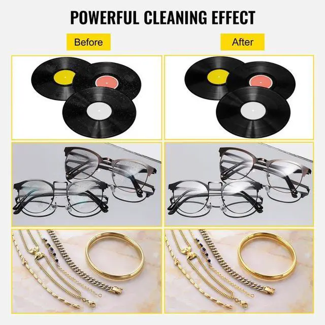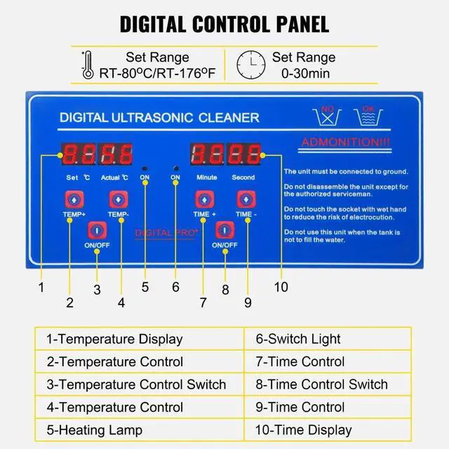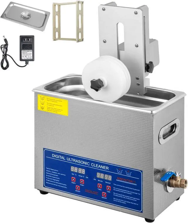 Brand: VEVOR,Input: 110V 60Hz,Ultrasound Frequency: 40KHz,Capacity: 6L/1.6 Gal,Working Temperature: RT-176°F/RT-80°C,Heater Power: 400W,Material: 304 Stainless Steel,Internal Tank Size: 30X15X15cm / 11.8X5.9X5.9",Ultrasonic Power: 180W,Time Adjustable: 0-30min,Net Weight: 5.2kg / 11.5LB,Product Size: 36.8X34X16cm/14.5X13.4X6.3"