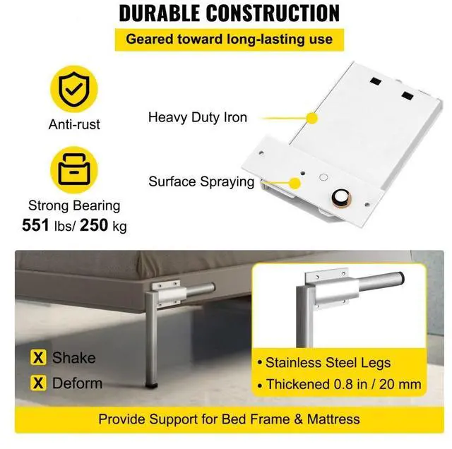 Bearing Capacity: 551 lbs/ 250kg,Color: White,Model: VV-CJ-CFCJ,Spring Mechanism Dimension: 9.3x5.7 in/ 235x145 mm,Material: Iron + Stainless Steel,Murphy Bed Type: Horizontal,Weight: 13.2 lbs/ 6kg,Compatible Bed Size: 0.9-1.2 M Width(Twin or Queen Size),Leg Dimension: 14x10x0.8 in/ 355x255x20 mm