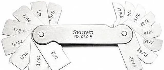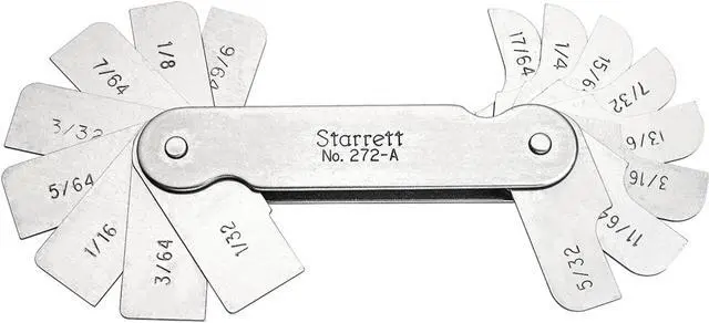 The Starrett 272 Fillet or Radius Gage is an external and internal radius on each leaf permits both concave and convex surfaces to be measured. The leaves are specially shaped for use in any position at any angle to measure fillets and radii in corners or against shoulders. Each leaf is stamped with the radius size and has an eccentric mounting for clearance between the leaf and the case when the gage is opened. 16 Leaves, 1/32-17/64 Range by 64ths.