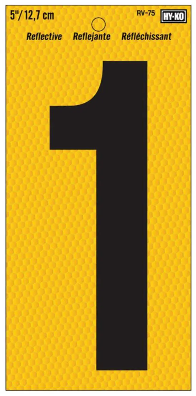 Brand Name: Hy-Ko Height: 5 in. Reflective: Yes Font Color: Black Material: Vinyl Mounting Type: Self-Adhesive Product Type: Number Letter or Number: 1 Number in Package: 1 pc. Weather Resistant: Yes