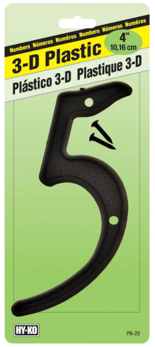 Brand Name: Hy-Ko Height: 4 in. Reflective: No Font Color: Black Material: Plastic Mounting Type: Nail-On Product Type: Number Letter or Number: 5 Number in Package: 1 pc. Weather Resistant: Yes
