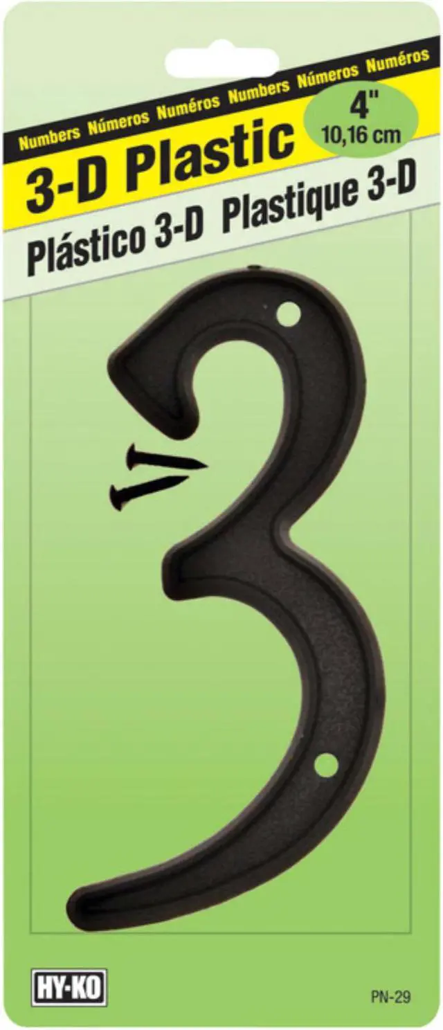 Brand Name: Hy-Ko Height: 4 in. Reflective: No Font Color: Black Material: Plastic Mounting Type: Nail-On Product Type: Number Letter or Number: 3 Number in Package: 1 pc. Weather Resistant: Yes