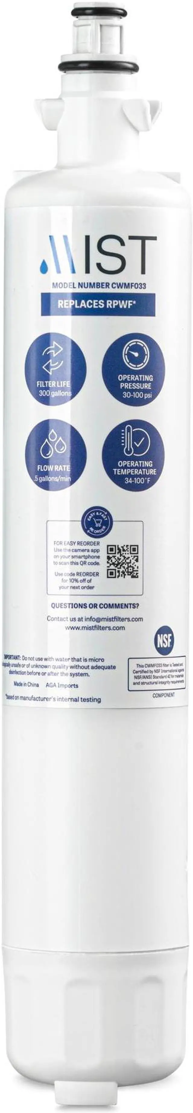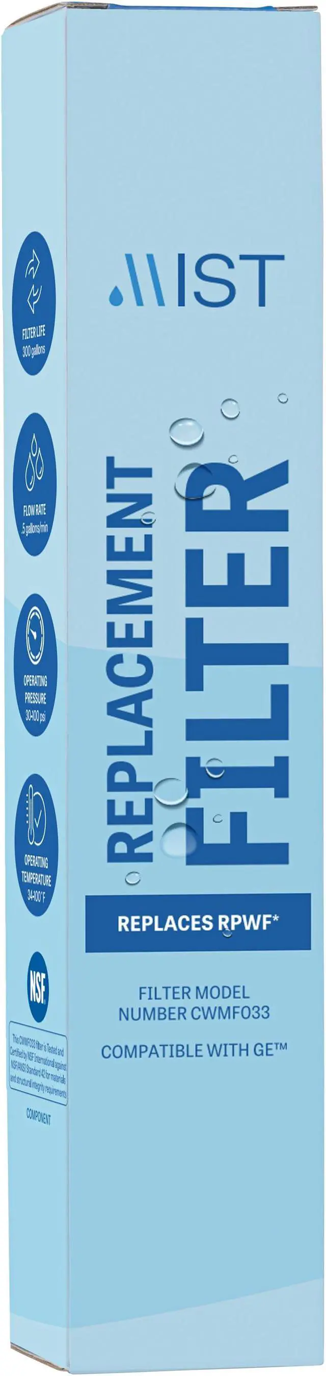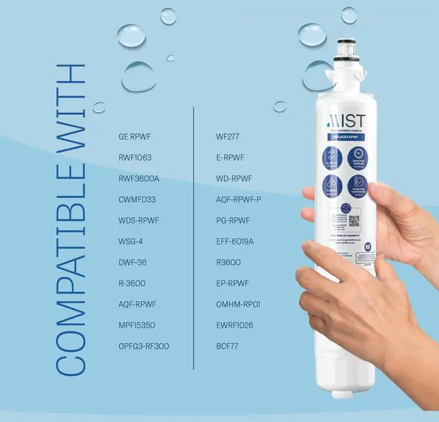 Mist GE RPWF replacement water filter reduces chlorine, taste and odor, to deliver clean, refreshing water. Tested and certified by NSF International to NSF/ANSI Standard 42.