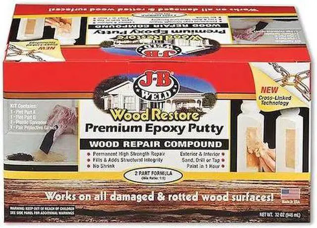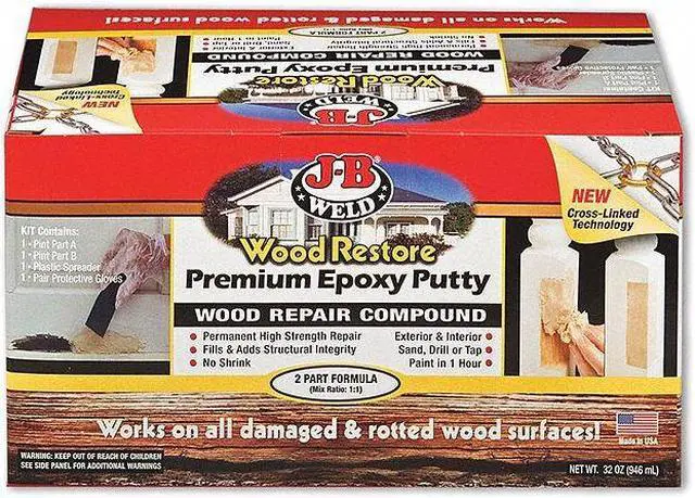 Epoxy Putty Kit, Container Type Box, Application Wood Repair, Base Material Epoxy, Color Brown, Container Size 32 oz, Full Cure Time 1 hr, Maximum Performance Temperature Not Applicable, Minimum Performance Temperature Not Applicable, Working Time 20 min, Finishing Features Machinable, Paintable, Sandable, For Use On Surface Material Wood, VOC Content 0 g/L, For Use With Damaged and Rotted Wood Surfaces, Product Form Putty, Product Type Epoxy Putty Kit. This item has been restricted from sale in the following state (s): []