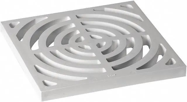 Grate, Product Type Grate, Overall Width 9 1/4 in, Overall Length 9 1/4 in, Material Plastic, Installation Type Drop-In, Color White, Grate Surface Type Radial, Shape Square, Load Capacity Not Applicable, ADA Compliant No, Overall Height 3/4 in, For Use with Drain Type Floor Drain, Drain Style Round, Standards ASME A 112.21. 1M, ASTM D2665. This item has been restricted from sale in the following state (s): []