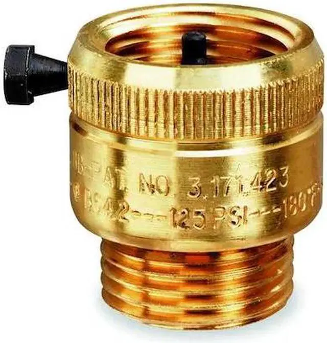Vacuum Breaker, Size 3/4 in, Connection Type GHT, Material of Construction Brass, Seal Rubber, Max. Pressure 125 psi, Temp. Range 180 Degrees F, Height 1 1/2 in, Width 1 3/8 in, Standards ANSI A 112.1. 3 (ASSE 1011), ASSE 1001, cCSAus B 64.2, IAPMO, UPC. This item has been restricted from sale in the following state (s): []