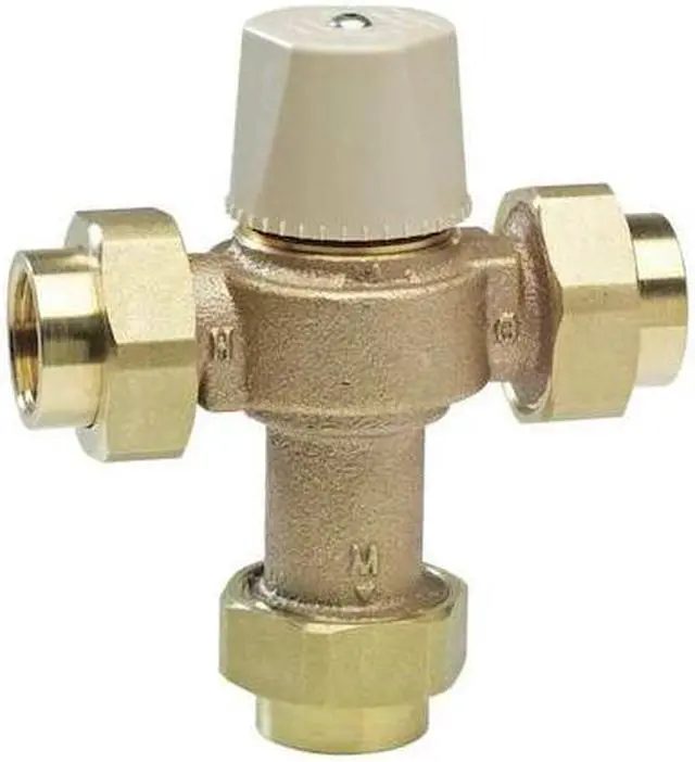Thermostatic Mixing Valve, Body Material Copper Silicon Alloy, Flow Rate 13 gpm, Inlet Type Union, Outlet Type Threaded, Inlet Size 1 in, Outlet Size 1 in, Temp. Range 80 Degrees to 120 Degrees F, Max. Pressure 150 psi, Overall Height 5 5/8 in, Overall Width 5 5/16 in, Inlet Temperature (Cold) 33 Degrees to 85 Degrees F, Inlet Temperature (Hot) 120 Degrees to 180 Degrees F, For Use With Domestic Hot Water Applications. This item has been restricted from sale in the following state (s): []