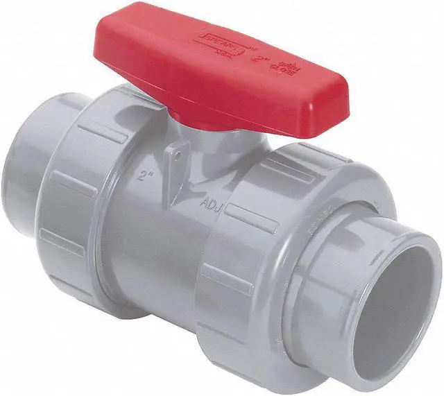 Ball Valve, Body Material CPVC, Body Style Inline, 3-Piece, Pipe Size 1 1/2 in, Connection Type Socket x FNPT, Standard Port, Max. Pressure 235 psi CWP, Temp. Range 32 Degrees to 190 Degrees F, Ball Material PVC, Seat Material FKM, Stem Type Safe-T-Shear (R), Handle Type Tee, Handle Material Polypropylene, Stem Material PVC, Body Seal Material FKM