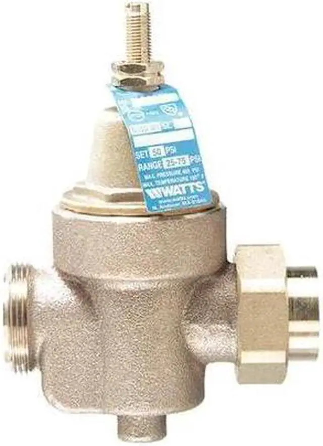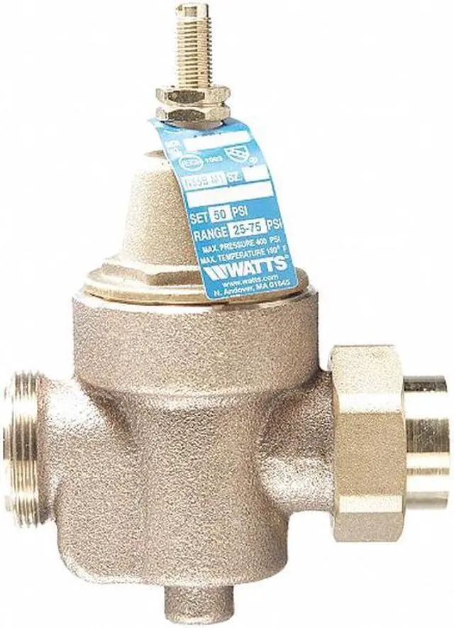 Water Pressure Reducing Valve, Valve Type Standard, Strainer Yes, Material Lead Free Copper Silicon Alloy, Pipe Size 1 In., Preset Pressure Settings 50 psi, Pressure Adjustment Range 25 to 75 psi, Connection Type NPT Union x FNPT, Height 6-1/4 In., Length 4-7/8 In., Max. Temp. 180 Degrees F, Max. Pressure 400 psi, Compliance ASSE Standard 1003; (ANSI A 112.26. 2); CSA Standard B356; and listed by IAPMO. This item has been restricted from sale in the following state (s): []