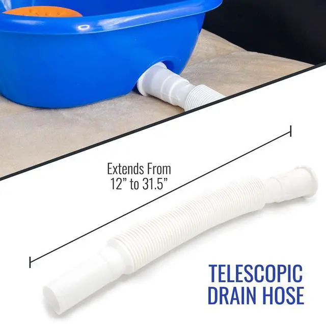 Includes hose and stopper to conveniently remove water from the basin. Telescopic drain hose extends from 12” to 31.5”.