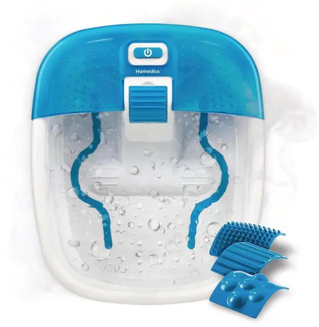 The HoMedics Bubble Bliss Deluxe Foot Spa surrounds your feet with massaging bubbles to relax and rejuvenate. This stimulating foot spa has raised nodes to provide the comfort of a gentle foot massage with heat maintenance technology. The Bubble Bliss Deluxe Foot Spa has a convenient toe-touch control and an integrated splash guard to prevent excess splashing and spills. Create a personal, customized massage experience as you choose from 3 acupressure attachments.