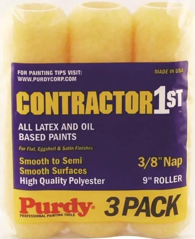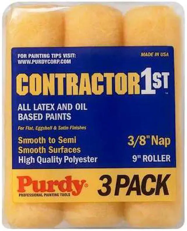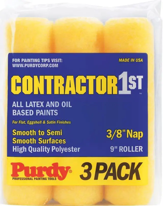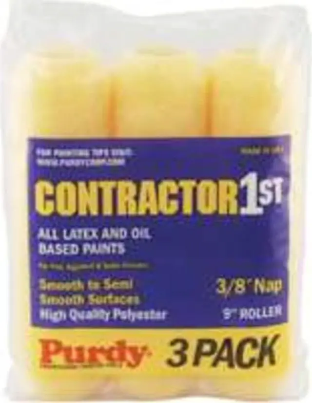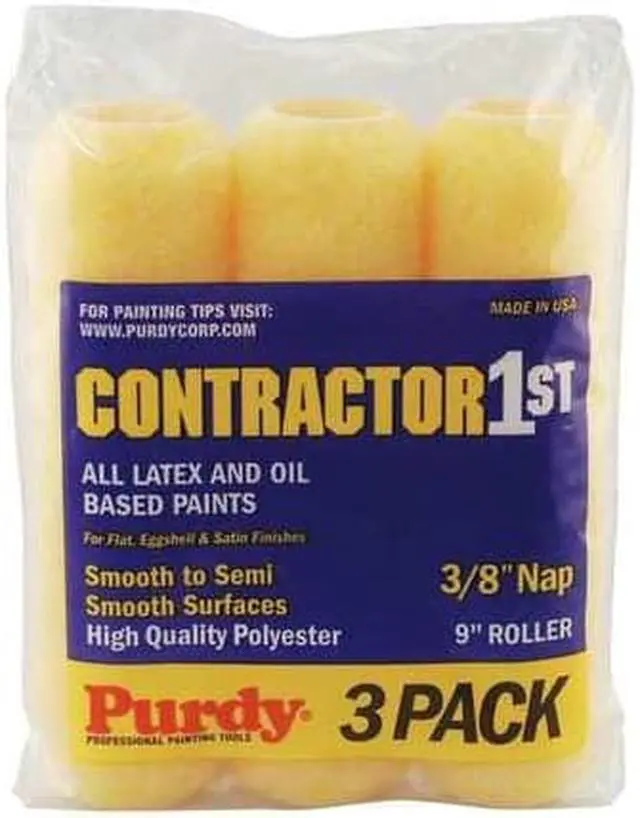 Paint Roller Cover, Cover Type Standard, Surface Texture Semi-Smooth, Smooth, Compatible Roller Frame Style Cage, 9 in Overall Length, 3/8 in Nap Size, Surface Material Concrete, Drywall, Paint Type Oil Based Paints, Water Based Paints, Core Diameter 1 1/2 in, Cover Material Polyester, Core Material Polypropylene, Sheen Type Eggshell, Flat, Satin, Package Quantity 3