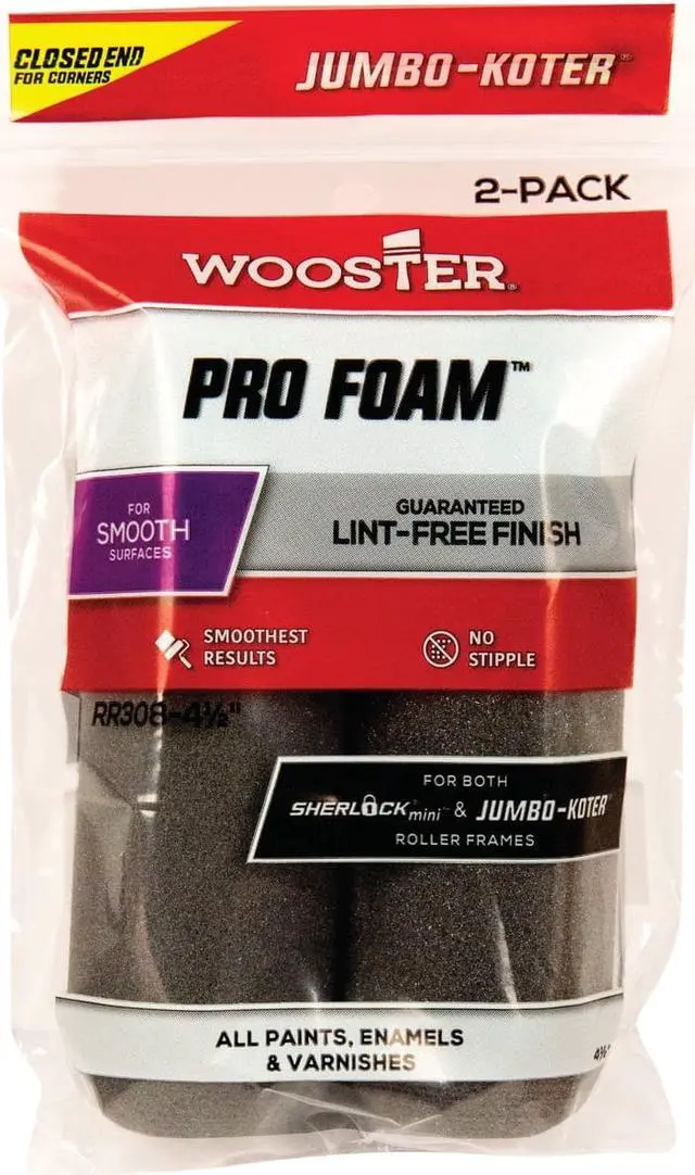 Mini Paint Rollers, Cover Type Standard, Surface Texture Smooth, Compatible Roller Frame Style Cage, 4 1/2 in Overall Length, 0 in Nap Size, Surface Material Drywall, Metal, Wood, Paint Type All Paints, Enamels, Varnishes, Core Diameter 3/4 in, Cover Material Foam, Core Material PVC, For Use With Jumbo-Koter Cage Frames, Package Quantity 2
